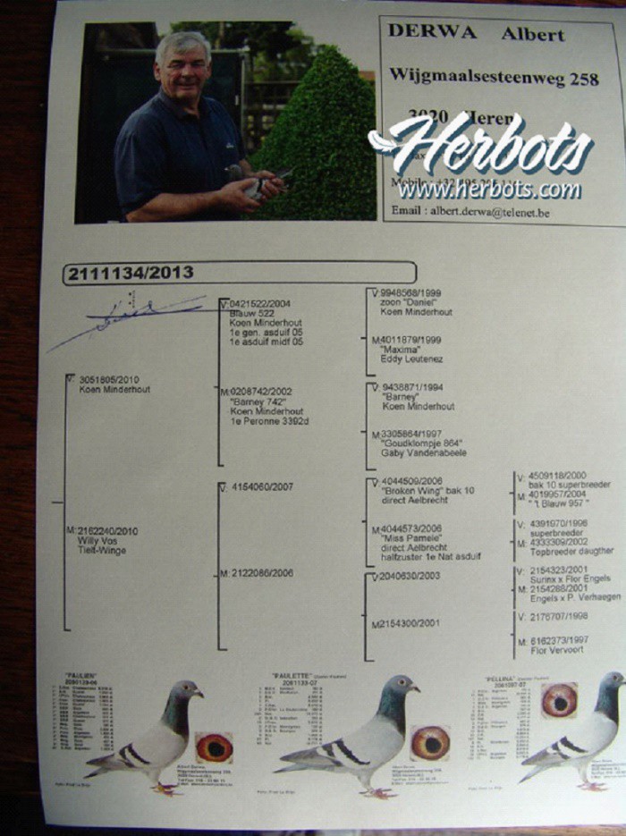 2 013年比利時亞精頓II國家賽全國總冠軍鴿B13-2111134灰母 血統書(亞伯特.德瓦鴿系)