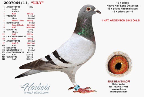 獲得比利時亞精頓II國家賽 "成鴿組” 5.942羽全國冠軍是大家耳熟能詳的台灣女婿范林登(Vanlint Michel)鴿舍,該舍冠軍鴿B11-2007064灰母“莉莉”是在比利時時間星期六下午14時10分02秒返舍,翔距540.569公里,創下平均分速1318.35 米/分。