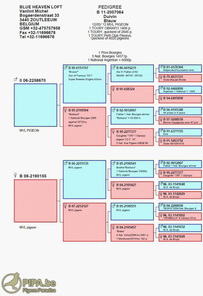 祖祖父:B99-6151767“布魯圖斯”,英格斯大銘鴿“231號”直子,超級種鴿