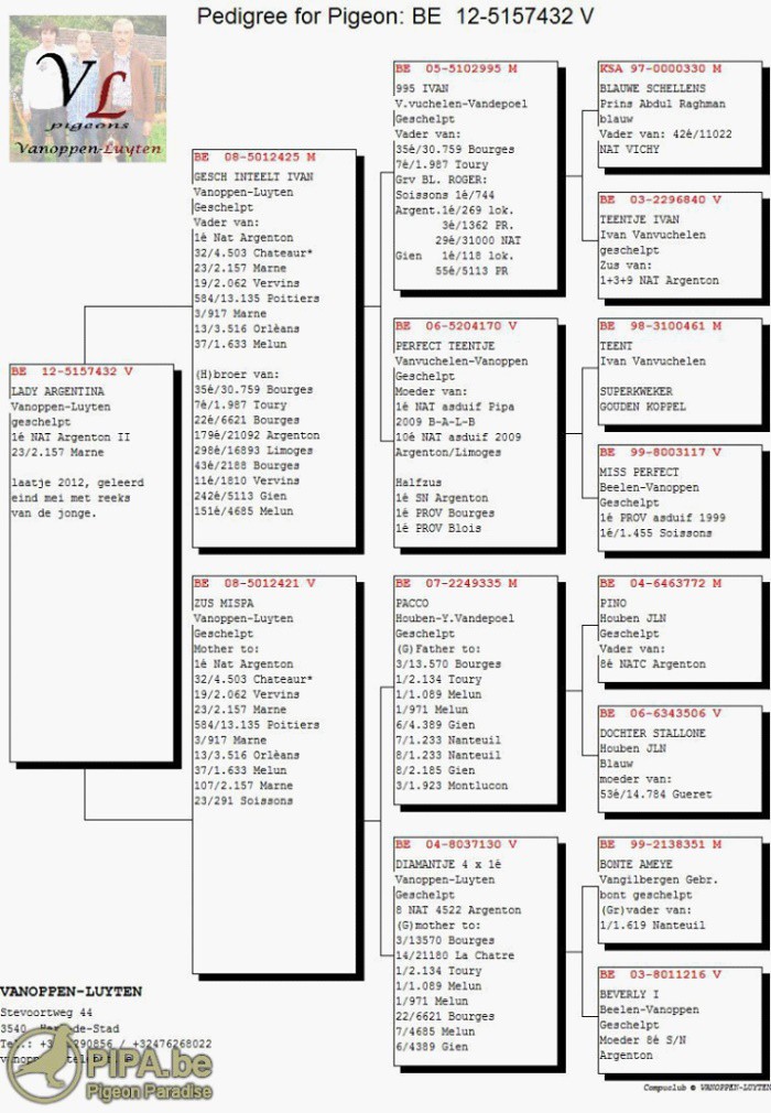 獲得比利時亞精頓II國家賽"一歲鴿組”6.797羽全國冠軍是范諾本-路耶騰(Vanoppen-Luyten)鴿舍,該舍冠軍鴿B12-5157432班母是在比利時時間星期六下午14時22分58秒返舍,翔距552.904公里,創下平均分速1307.2 米/分。