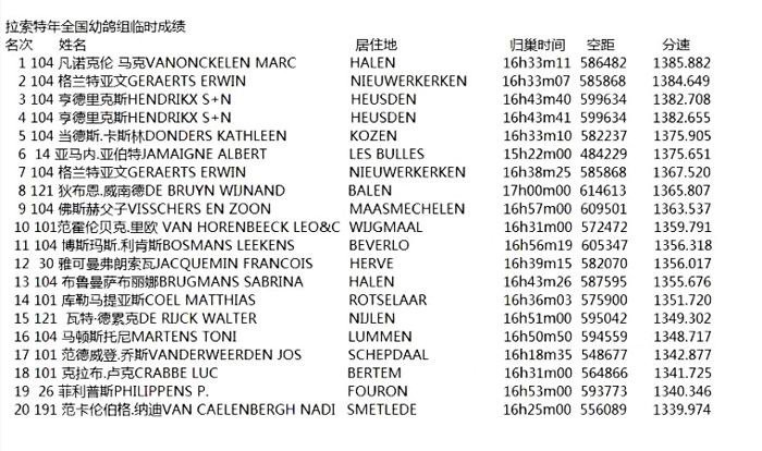 2013年拉索特年II全國賽幼鴿組13.089羽臨時成績(前20位)