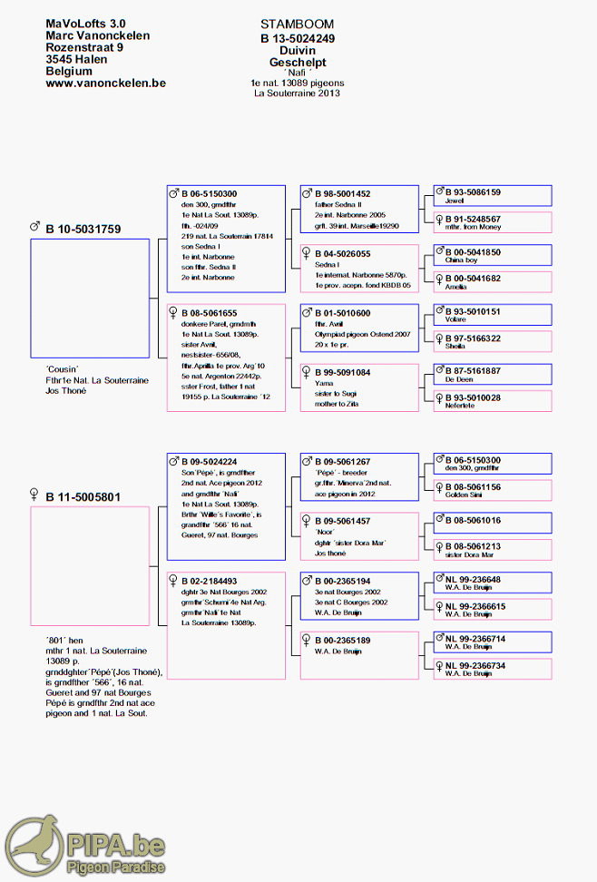 2013年比利時拉斯特年II(La Souterraine II)幼鴿組13.089羽冠軍鴿B13-5024249班母 血統書