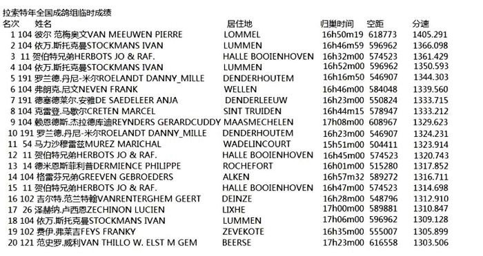 2013年拉索特年II全國成鴿組4.144羽臨時成績(前20位):