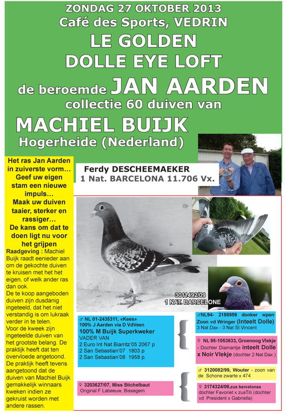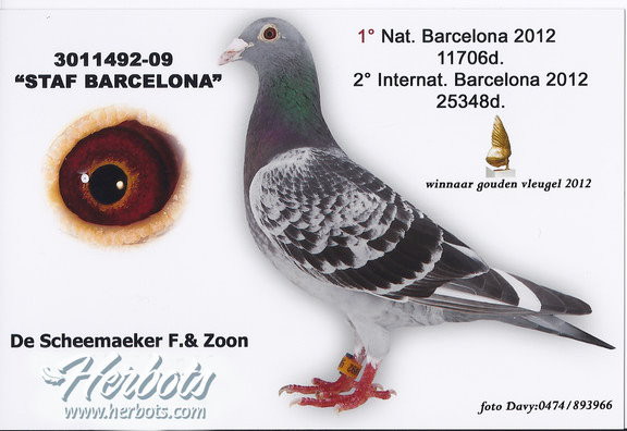 2012年巴塞隆納國際賽獲得比利時全國1.043公里11.706羽冠軍,國際25.348羽總亞軍鴿,屬標準的多力家族代表鴿,俱有漂亮的"古銅色及紫蘿蘭眼誌"。
