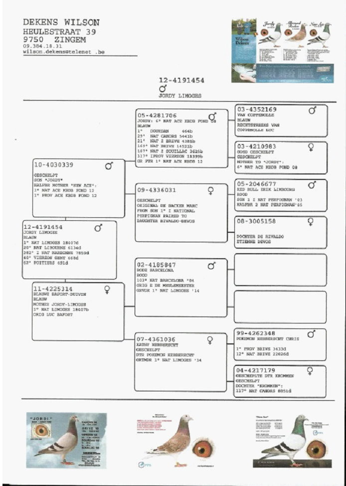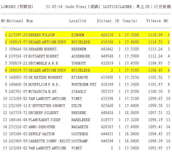 獲得2014年利蒙治全國賽(成鴿)18.407羽冠軍:Dekens Wilson (德肯斯 威爾森)鴿舍,冠軍鴿是在比利時時間星期六下午17:35:00秒返舍,空中距離626.130 km, 創下平均分速1118.09米/分。