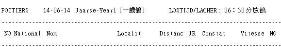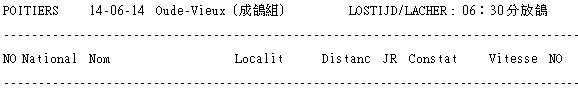 波提爾(Poitiers)國家賽比賽,平均空距:550-600公里,交鴿時間是6月12日總數有26.486羽(含12.377羽成鴿和14.109羽一歲鴿),放鴿時間是6月14日(星期六)早上6時30分。