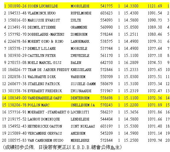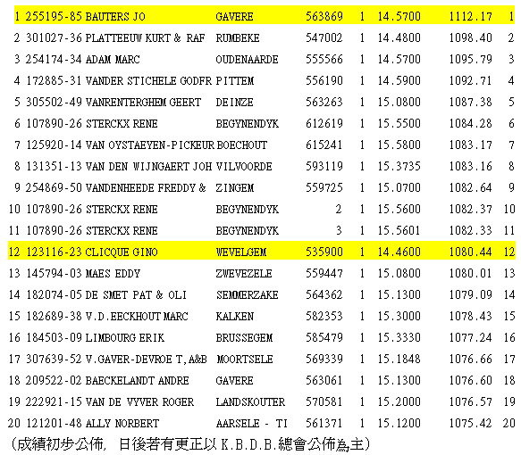 1. "夏洛尼"10/113:南特伊17.176羽冠軍、34.200羽最快鴿、波治13.490羽亞軍。