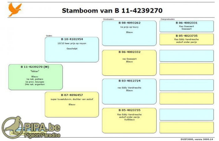 獲得波提爾比利時全國冠軍(成鴿組)冠軍:巴特斯.喬(Bauters Jo)鴿舍,冠軍鴿BE11-4239270 灰公是在比利時時間星期六下午14時57分0秒歸巢,翔距563.869公里,創下平均分速1112.17米/分。另一中距離強豪吉諾.克里克(CLICQUE GINO)入少賞12位。