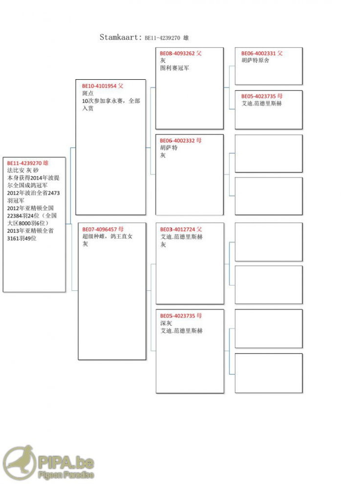 BE11-4239270 灰公,本身獲得2014年波提爾全國成鴿冠軍。