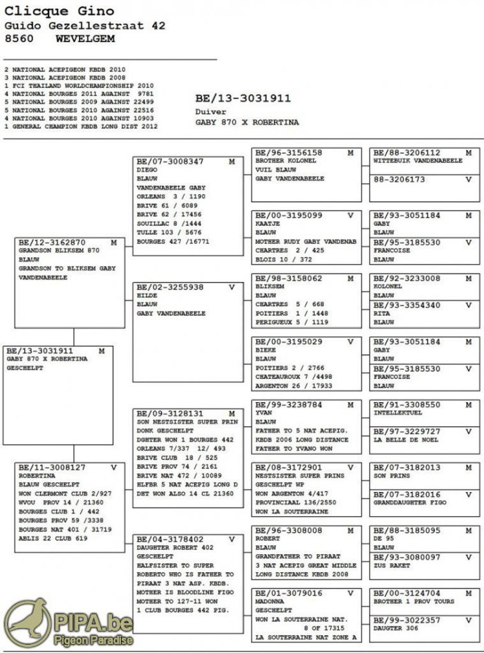 獲得比利時蒙特呂松全國冠軍(一歲鴿組)冠軍吉諾.克里克(Clicque Gino)鴿舍,該舍冠軍鴿B13-3031911班公,是在比利時時間星期六下午13時22分59秒返舍,空中距離498.536公里,創下平均分速1252.61米/分。