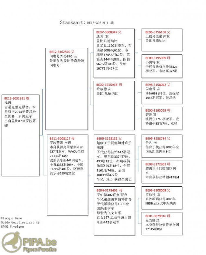 2014年比利時蒙特呂松全國(成鴿組13.961羽)冠軍B11-4087835灰公 血統書