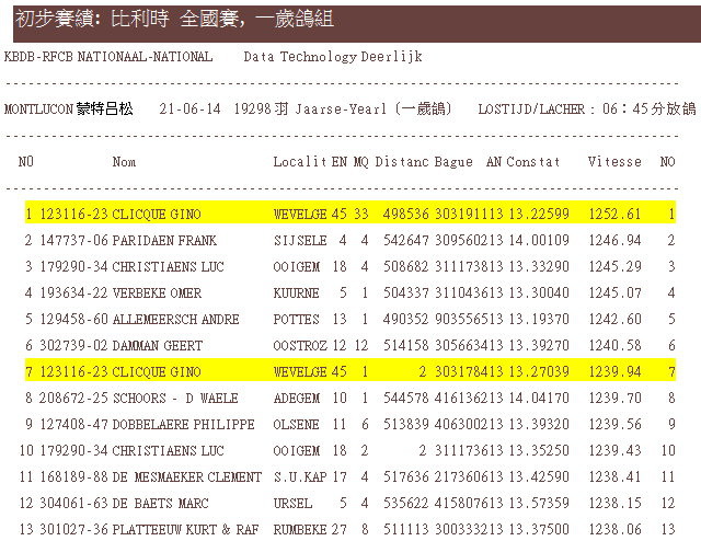 吉諾.克里克(Clicque Gino)蒙特呂松國家賽,除冠軍外還囊括了7、17、29、64、66、95位等前100名內入賞7羽之多。