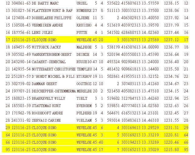 吉諾.克里克(Clicque Gino)鴿舍這回蒙特呂松國家賽表現出奇的傑出,除冠軍輕鬆入袋還囊括了7、17、29、64、66、95位等前100名內入賞7羽之多。