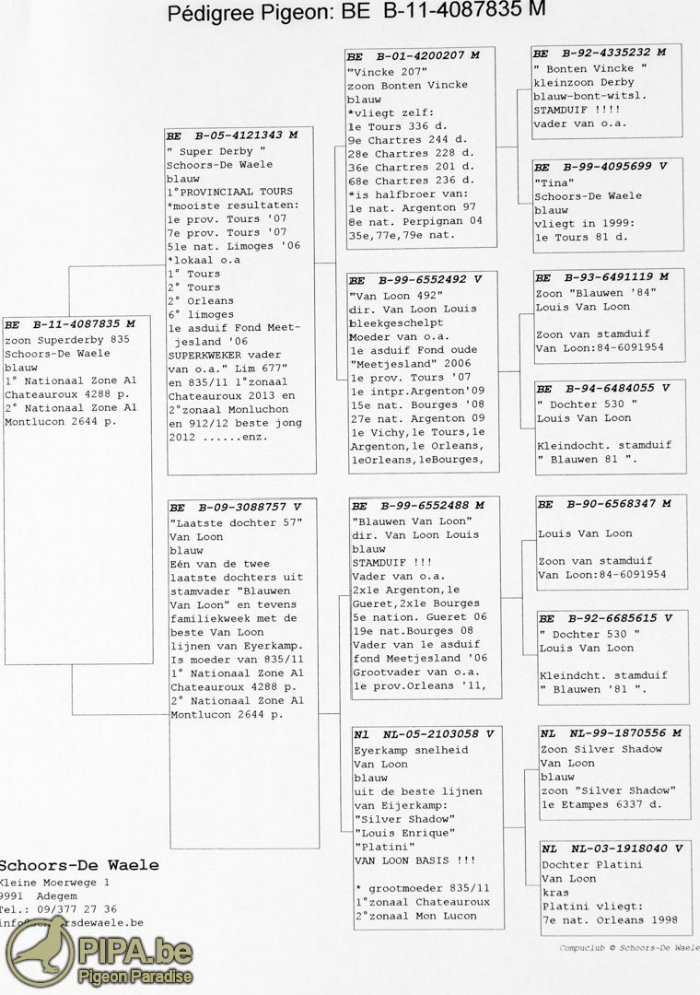 獲得蒙特呂松比利時全國(成鴿組13.961羽)冠軍斯豪斯-德瓦勒(Schoors-De Waele)鴿舍,該舍冠軍鴿B11-4087835灰公,是在比利時時間星期六下午13時54分50秒返舍,空中距離544.578公里,創下平均分速1266.95米/分。