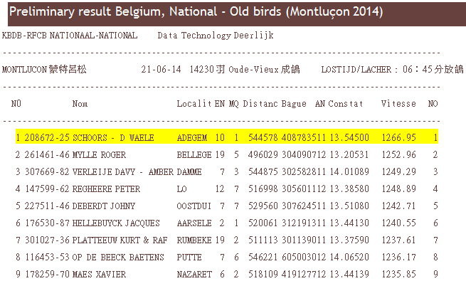 2014年比利時蒙特呂松(Montlucon)國家賽(距離約515公里)於6月19日交鴿,全國賽總參賽羽數為32.922羽(包括13.961羽成鴿和18.961羽一歲鴿),相較2013年的總上籠羽數為40.358羽,少了7.436羽。於6月21日(星期六)早上6時45分放鴿,天氣狀況:天空晴朗,最高溫度22-25°C,比賽開始前段為東風,後半段轉為東北風,因此比賽進程將比較困難