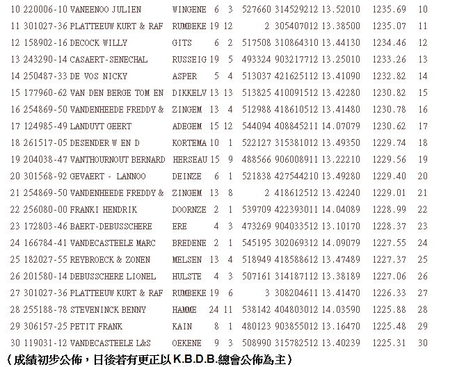 2014年蒙呂松全國賽一歲鴿組18.961羽(前30位)臨時成績: