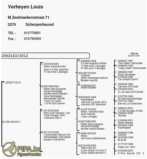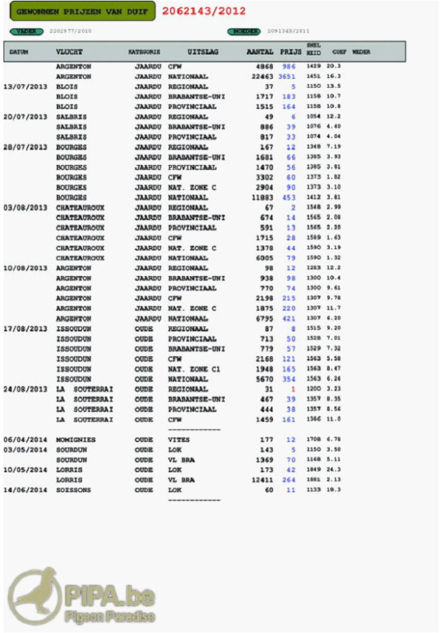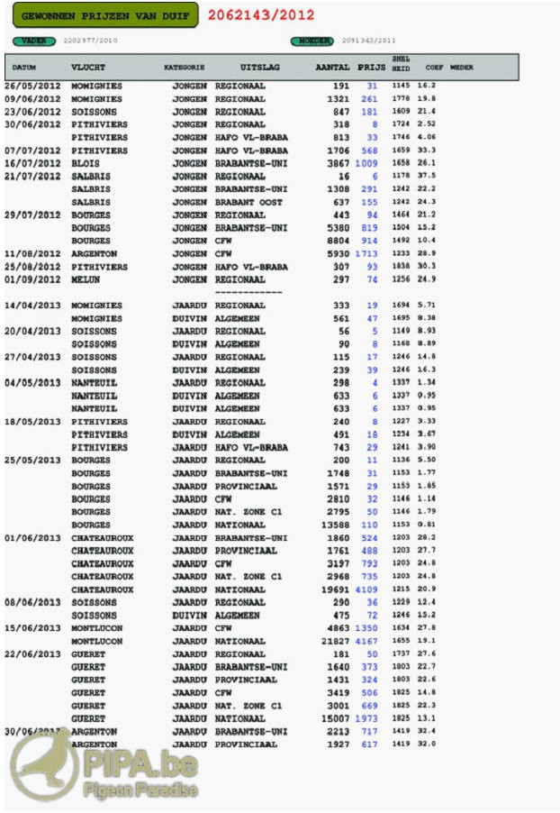 獲得比利時拉斯特年I (La Souterraine I )"成鴿組7.245羽"冠軍佛海恩 路易士(Verheyen Louis)鴿舍,該舍冠軍鴿B12-2062143班母是在比利時時間星期六下午16時12分28秒歸巢,空中距離584.828公里,創下平均分速1187.55 米/分。