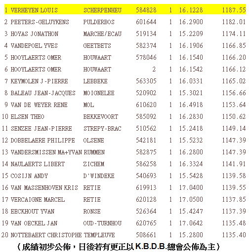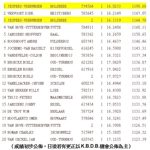 拉索特年I (La Souterraine I )比利時全國一歲鴿組9.204羽冠、季軍為傑斯普.範德維根(Jespers-Vanderwegen)鴿舍