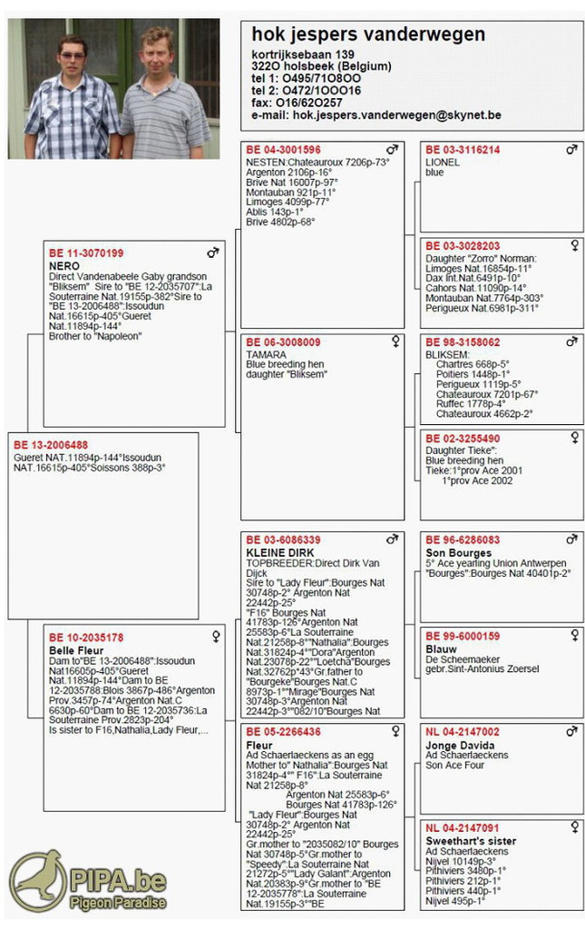 獲得拉索特年I (La Souterraine I )比利時全國一歲鴿組9.204羽冠軍為傑斯普.範德維根(Jespers-Vanderwegen)鴿舍,該舍冠軍鴿B13-2006488灰母是在比利時時間星期六下午16時02分33秒返舍,空中距離574.564公里,創下平均分速1190.68 米/分,除獲得一歲鴿組9.204羽冠軍外,更是此回拉索特年I總交鴿數16.449羽的總冠軍鴿,更值得一提且難能可貴的是該舍同時入賞冠、季軍(16時13分19秒)兩羽選手鴿僅差11分鐘接踵抵達。