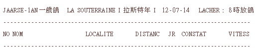 2014年比利時拉斯特年I (La Souterraine I 約550公里)國家賽,7月10日集鴿總數16.449羽含(成鴿7.245羽、一歲鴿9.204羽),於7月12日(星期六)上午8時放鴿。
