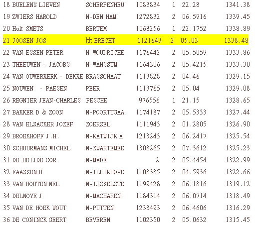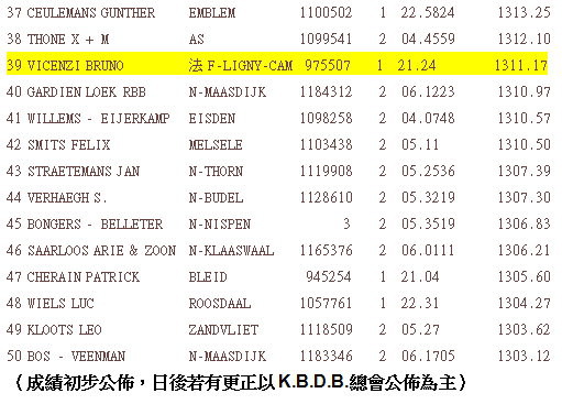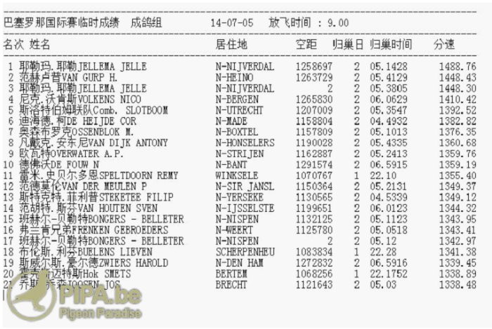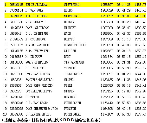 巴塞隆納國際賽21.143羽總冠軍為荷蘭耶勒瑪(Jellema)鴿舍