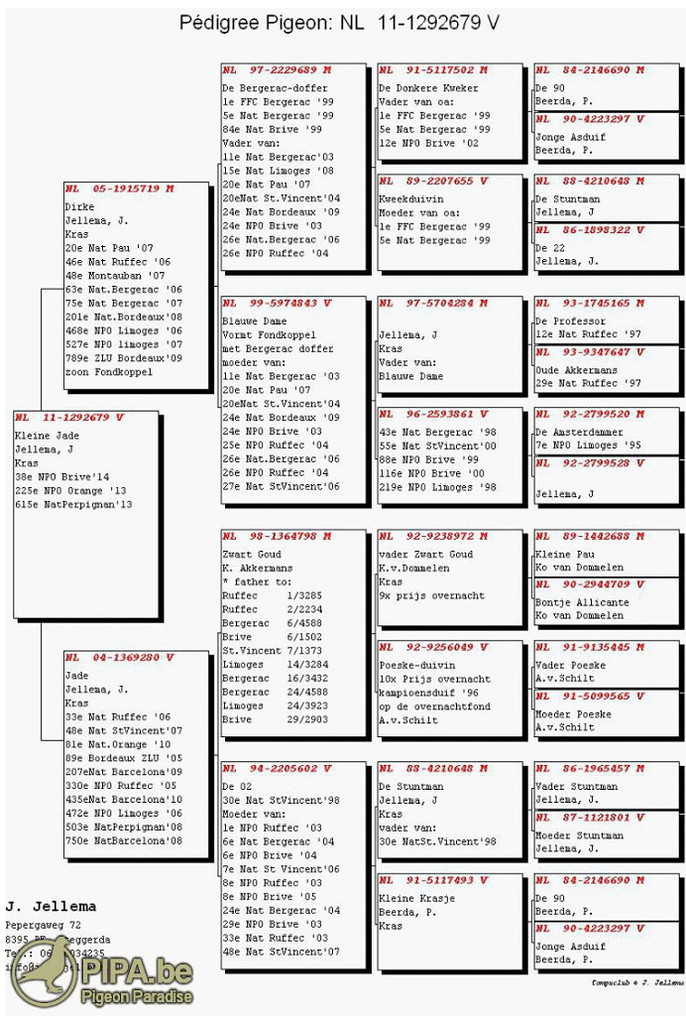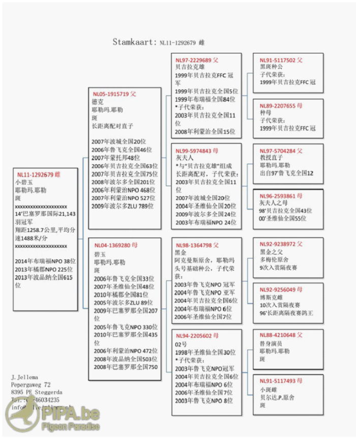 -外祖父鴿:NL98-1364798 "黑金",耶勒瑪頭號基礎種公,荷蘭深具影響的超長距離種鴿之一,其子代榮獲: