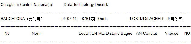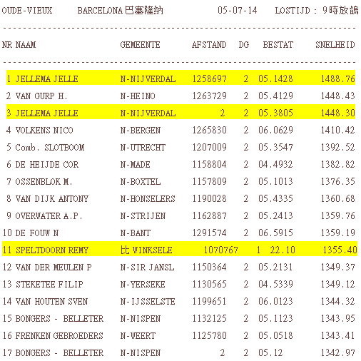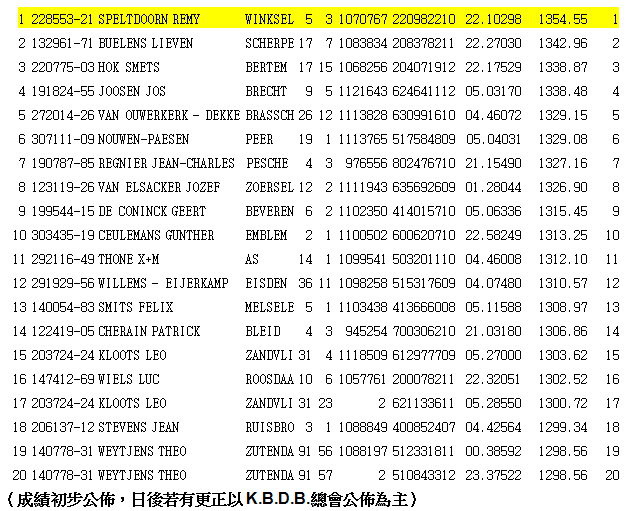 獲得巴塞隆納比利時全國8.851羽冠軍:史貝爾多恩.雷米(Speltdoorn Remy)鴿舍,該舍冠軍鴿B10-2209822銀公,於當日晚上10時10分返舍,空中距離1070.767公里,創下平均分速1355.40米/分。