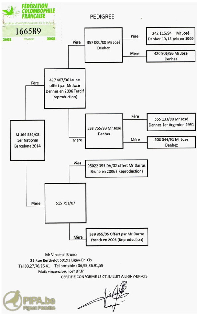 冠軍鴿為一羽4歲銀色公鴿,他的父親全兄弟作育子代"雷米"B07-2060539銀公,獲得隆河谷全國鴿王冠軍及蒙特利瑪全國4位、橘郡全國17位,馬賽全國28位為艾力克.林伯格所引進,這羽冠軍鴿曾獲得卡奧爾全省亞軍的成績。