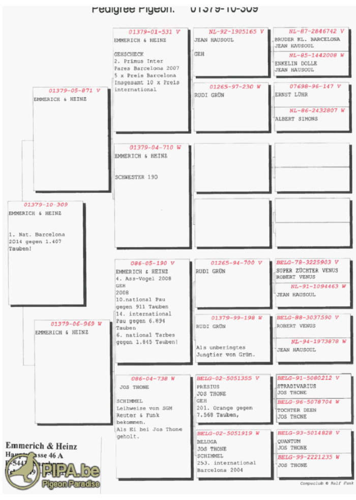 巴塞隆納德國全國1.367羽冠軍海因茨.艾默里奇-SG鴿舍,該舍冠軍鴿DV01379-10-379雜花公,創下平均分速1294.79米/分,獲得德國參加巴塞隆納國際賽全國1.367羽冠軍。