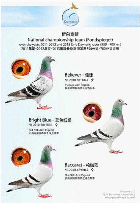 我為什麼這麼說呢?因為他在這之前還為我作育出2011-2012-2013這三個季度450公里-750公里12次最佳賽績總評冠軍的信徒(NL10-5011847班公)匹斯維爾(Pithiviers)603公里6名/7.749羽;布瑞歐(Breuil le vert)485公里9名/9.786羽。當時我是將藍色之星選配的新希望(NL07-1207604班母)。新希望是小迪克的半兄妹。這樣的超級配對在4年前作育出了一羽超級鴿王,而在2013年又作育出了卡奈斯!這不得不說藍色之星這羽公鴿是一羽超級種公!能夠作育出這樣在600公里的大型比賽的超級賽鴿,我一定會好好呵護,讓他與我的若干羽一線種雌配對,相信可以作育出更多適合600公里的大型比賽的超級賽鴿!