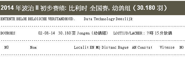 2014年比利時波治II (Bourges II)國家賽,於7月31日交鴿,於8月2日(星期六)早上7時15分放鴿,包含(成鴿8.008羽、一歲鴿10.114羽、幼鴿30.184羽),總計48.306羽參賽,較去(2013)年40.000羽多出8.306羽。