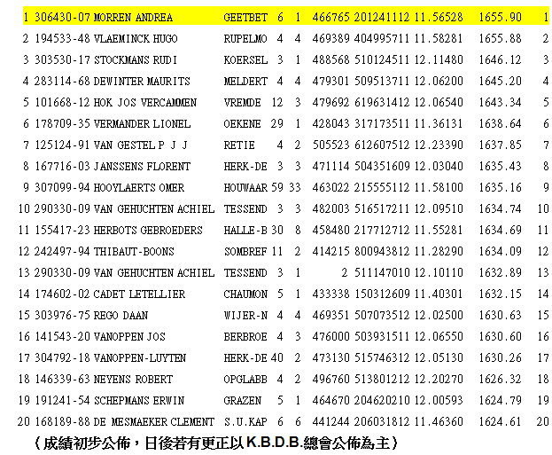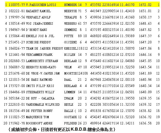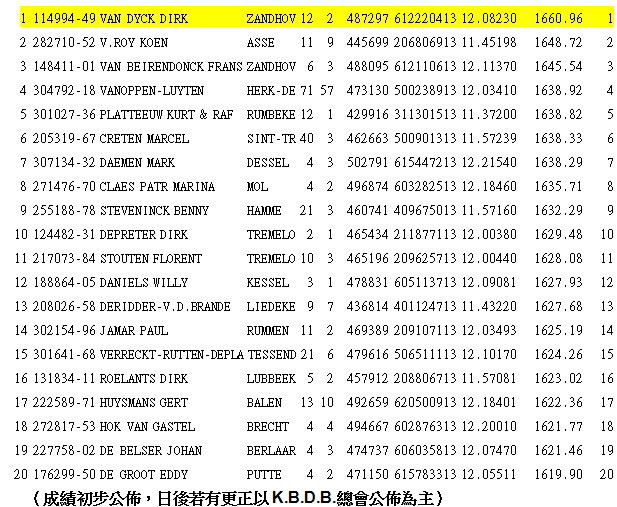 波治II比利時全國(一歲鴿組)10.114羽冠軍:
