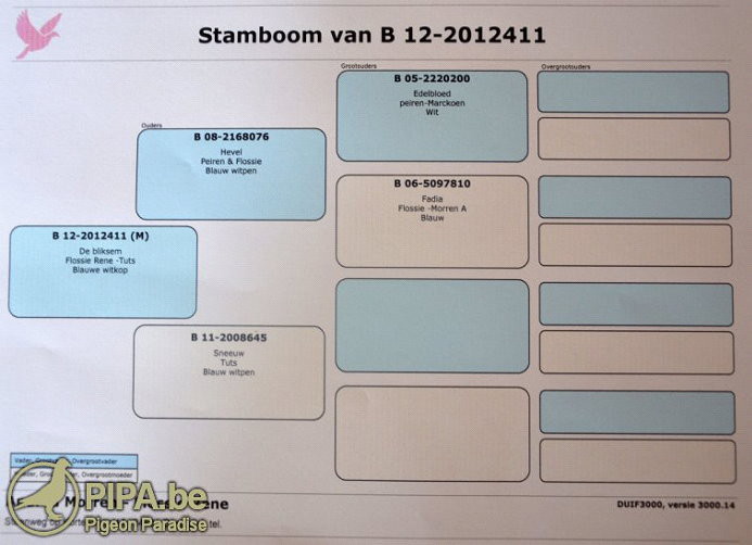 2014年波治II全國成鴿組8.008羽冠軍:B12-2012411 公.灰白花頭 血統書