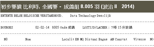 2014年波治II全國賽(成鴿組)8.008羽冠軍中文血統書資訊: