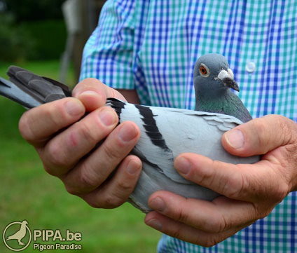 波治II比利時全國(成鴿組)8.008羽冠軍:莫倫 安德列(Morren Andrea)鴿舍,該舍冠軍鴿B12-2012411灰白頭公是在比利時時間星期六早上11時56分52秒返舍,空中距離466.765公里,創下平均分速1655.90米/分。