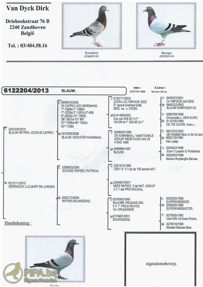 波治II比利時全國(一歲鴿組)10.114羽冠軍:范迪克(Van Dyck Dirk)鴿舍,該舍冠軍鴿B13-6122204灰母是在比利時時間星期六上午12時08分23秒返舍,空中距離487.297 公里,創下平均分速1660.96 米/分。
