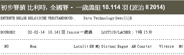2014年比利時波治 II全國(一歲鴿組)10.114羽"冠軍:B13-6122204灰母 中文血統書