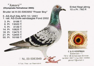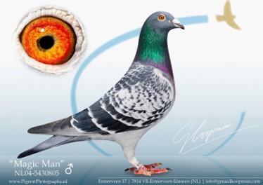 獲得這次比賽第三名拍賣價格為6.000歐元的父親來自于魔術愛神,來自於魔術師選配愛神作育而出。魔術師曾獲得利曼斯全國賽705公里120.936羽3名。愛神曾榮獲2003年度奧林匹克賽鴿組評選全能冠軍,2002年度當日歸比賽鴿王稱號。