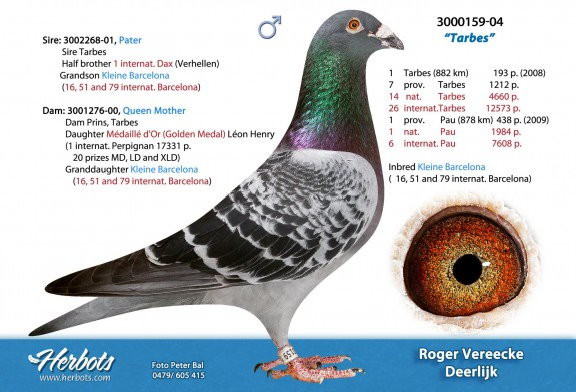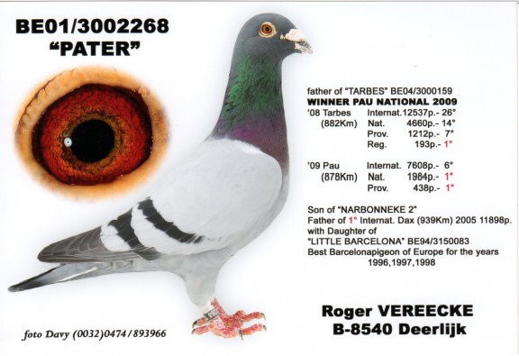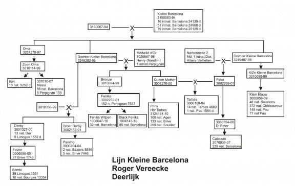 • 父親是"派特" ( 拉丁語" 父親 " 或祖先 ) , 腳環號 3002268-01。他是佛海倫•希賴爾的達克斯國際賽1名之半兄弟。它的母親是著名的"小巴賽隆納"直女。