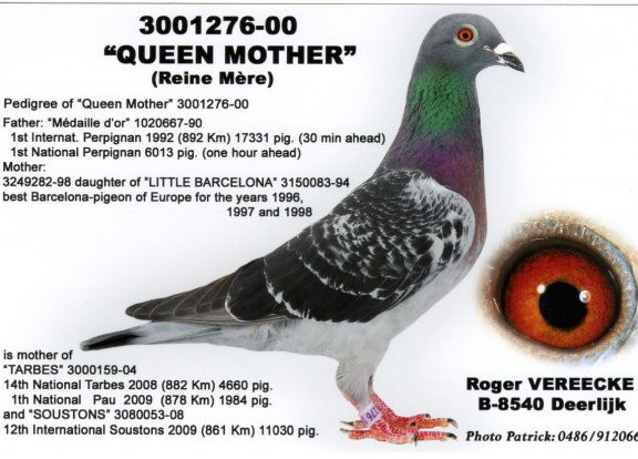 • 母親是"王后", 3001276-00。她是 "金牌"直女 , "金牌"榮獲 1992年波品納國際賽 17,331 羽1名(里昂•亨利使翔)。其母是還是 "小巴賽隆納"直女。