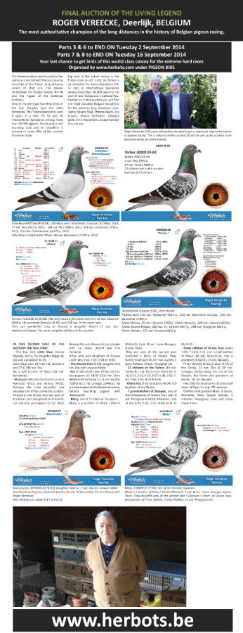 我們對賽鴿運動一位特別的偉人說"再見"。他在賽鴿運動中的成就是"賽鴿運動的一座豐碑",他是"活著的傳奇",是"賽鴿運動中的紳士",是"聖羅德維克的大師"……對於半個多世紀以來比利時鴿壇的頂尖選手,我們用這些來描述一位偉人和他鴿舍的成就,毫不為過。我同意,比利時賽鴿運動中有其他一些響噹噹的名字,但我們不知道還有誰能夠如此長時間地保持輝煌。現在羅傑•佛瑞卡大師的所有心血將被拍賣,所有鴿子將在網路上公開出售。購買遺傳潛力較高的長距離鴿獨一無二的時機!很可能是購買佛瑞卡原舍鴿的最後機會!在這之後,一切都將結束:德爾萊克的一切都將拆掉,不保留任何東西。羅傑與他的妻子將會搬到一家公寓。那兒不會有鴿子存在。