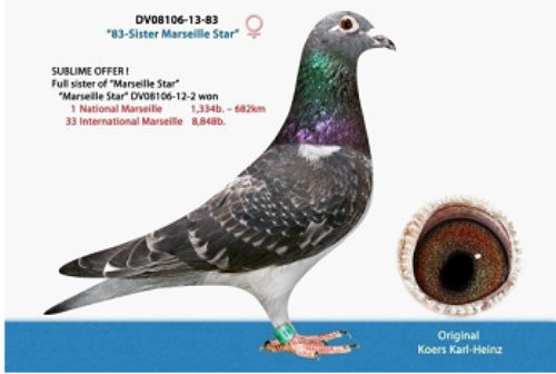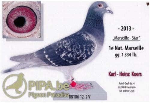 德國澳美舍姆(Ormesheim)區的卡爾-漢斯.科爾(Karl-Heinz Koers)鴿舍,包攬馬賽國際賽德國全國冠軍、亞軍、季軍、第4位、5位、6位及12位 (國際賽12位、21位、33位、62位、68位、83位)。