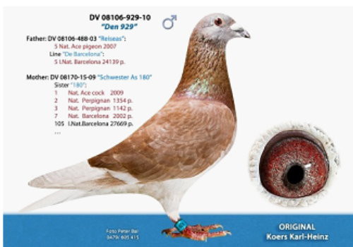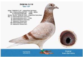 我們很想知道,能獲得此次驚人戰績的鴿子的血統情況是如何呢?卡爾-漢斯的妻子負責全部的文書方面工作。她給了我這6份血統書。首先,我們來看看這羽冠軍雄鴿,環號為08106-12-2班公。他的父親環號為08106-07-293出自"夜行者"(Nachtflieger,08106-03-488紅公)。293號這羽鴿子已經作育了數羽優秀賽將,比如2011年雌鴿王冠軍,2011年塔碧斯全國亞軍,2011年波品納全國亞軍,還有其他許多優秀賽將。"夜行者"是一羽優秀的賽將,更是一羽非常卓越的種鴿。他獲得了2005年全國雄鴿王第5位,波爾多全國2,447羽22位和波品納全國2,187羽40位。與"夜行者"配對的是"波品納小姐"(Miss Perpignan 08102-02-327灰母),榮獲2007年波品納全國冠軍。