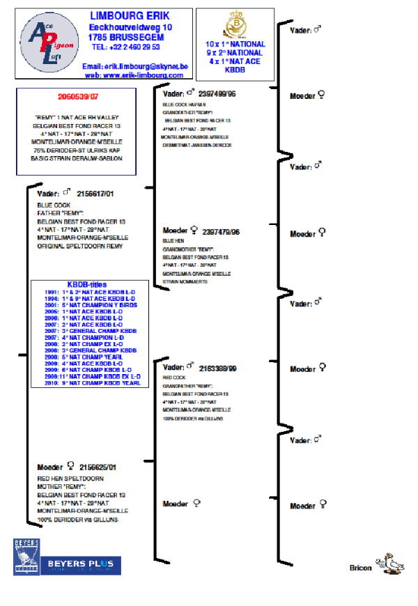 雷米.史貝爾多恩很幸運能夠在鴿舍中擁有這樣的天賦育種鴿系,這支鴿系已經成為眾多全國賽和國際賽佳績的血統基礎。這可能是雷米在賽鴿運動中保有的最好的秘密武器,事實上很多有經驗的鴿友在2013和2014賽季獲得優異成績,也是向雷米鴿舍引進該系後代才真正瞭解到這支鴿系的巨大潛力。