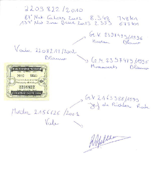 這羽神奇賽鴿作育的孫代為來自蒂爾特-溫赫(Tielt-Winge)的羅納德.洛德威克(Ronald Loderwijckx)鴿舍獲得2014年馬賽國際賽12.158羽冠軍。
