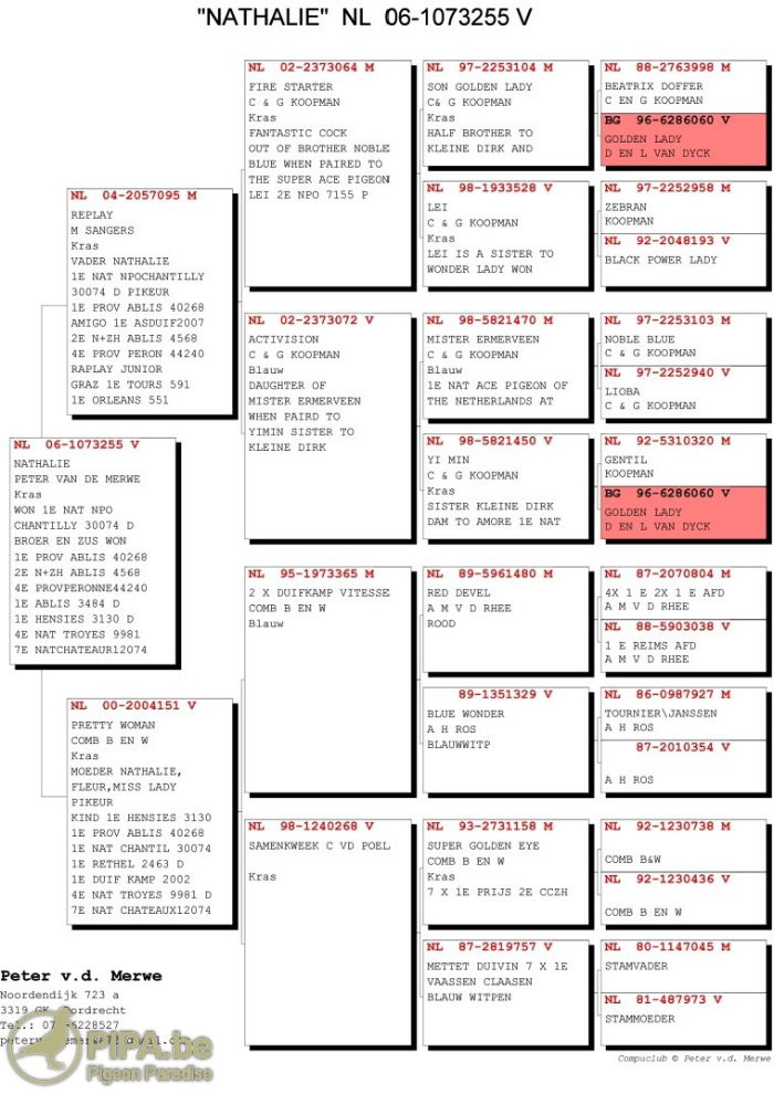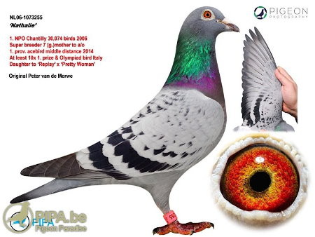 "重播號"的優秀直女"娜塔莉"(Nathalie NL06-1073255)是一羽非常成功的賽鴿,贏得了NPO翔特利全國賽30.074羽冠軍。此外她還作育了眾多冠軍子代,包括2014年全省中距離鴿王冠軍及貝羅尼 2,817羽冠軍 (=半省 9,776羽4位),史棟貝克 2,303羽冠軍,南圖 1,170羽冠軍, 莫城724羽冠軍,杜爾夫643羽冠軍