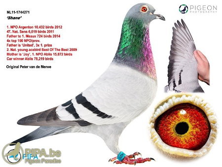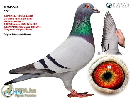 非常難以置信的是"喜悅號"作為一羽種鴿同樣非常有天賦。她作育的子代"夏恩"(Shane NL11-1744271),獲得了令人印象深刻的亞精頓賽10.432羽冠軍。