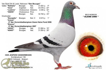 小迪克"來自迪克和路易士.凡戴克(Dirk and Louis Van Dyck)鴿舍。他是"波治號"(BE94-6323005)的直孫,"波治號"曾獲得波治全國40401羽亞軍,全兄姐"005/95"獲得KBDB全國中距離鴿王冠軍,查看"小迪克"的完整血統書。
