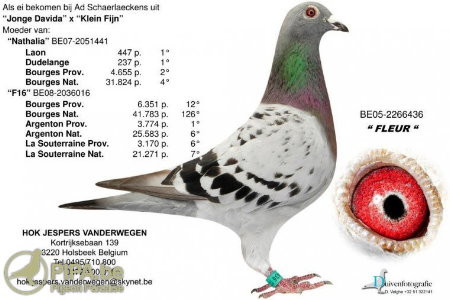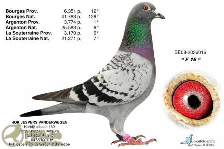 "F16"為"小迪克"和"芙蓉"的直子,幫助傑斯普-範德維根鴿舍成名。他通過在全國幼鴿賽中取得佳績展示了傑斯普-範德維根的實力: