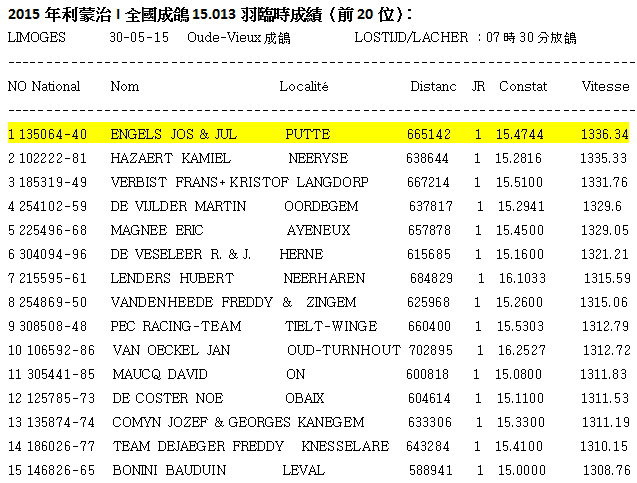 利蒙治I(Limoges I)國家賽(成鴿),於5月27日交鴿總數有15.013羽,於5月30日(星期六)早上7時30分放鴿。